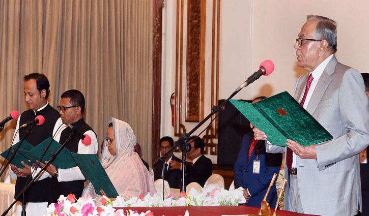 রোববার বিকেলে সাড়ে ৩টা থেকে বঙ্গভবনে ধাপে ধাপে শপথ অনুষ্ঠান হয়। নিয়ম অনুযায়ী সবার আগে বিকেল ৩টা ৩৯ মিনিটে শপথ নেন আওয়ামী লীগ সভাপতি ও প্রধানমন্ত্রী শেখ হাসিনা। শপথ বাক্য পাঠ করান রাষ্ট্রপতি আব্দুল হামিদ।