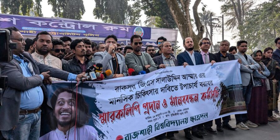 রাজশাহী, ১৯ জানুয়ারি ২০২৬: রাজশাহী বিশ্ববিদ্যালয় কেন্দ্রীয় ছাত্র সংসদের (রাকসু) সাধারণ সম্পাদক (জিএস) সালাউদ্দিন আম্মারকে মানসিক চিকিৎসা নেওয়ার দাবি জানিয়ে মানববন্ধন ও স্মারকলিপি প্রদান করেছে বিশ্ববিদ্যালয় শাখা জাতীয়তাবাদী ছাত্রদল (ছাত্রদল)।
